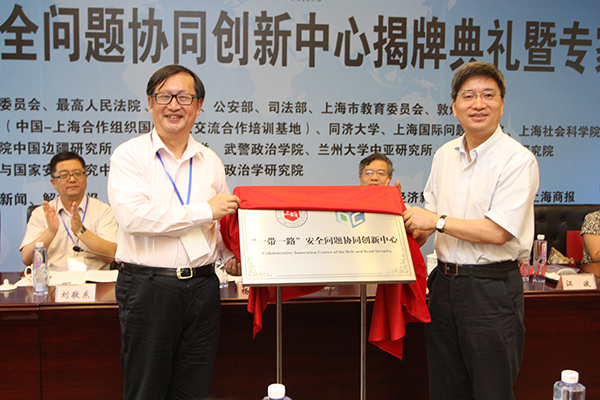 上海国际关系学会会长杨洁勉与新利18官方客服校长周仲飞为“一带一路”安全问题协同创新中心揭牌。