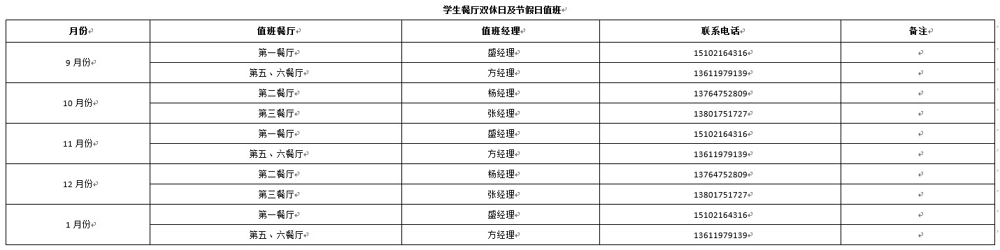 各位师生:根据学校后勤保障工作安排,现将2016年秋季学期学校餐厅双休日及节假日期间开放值班安排通知如下。 注: 1.如有不确定因素需要调整值班食堂的,以接到综合服务科书面通知为准。 2.清真餐厅在没有特殊情况下周六、周日每周均正常开放。马经理电话:18616130843。 3.遇到特殊情况,特殊安排,一切服从甲方要求。后勤保障处2016年9月8日