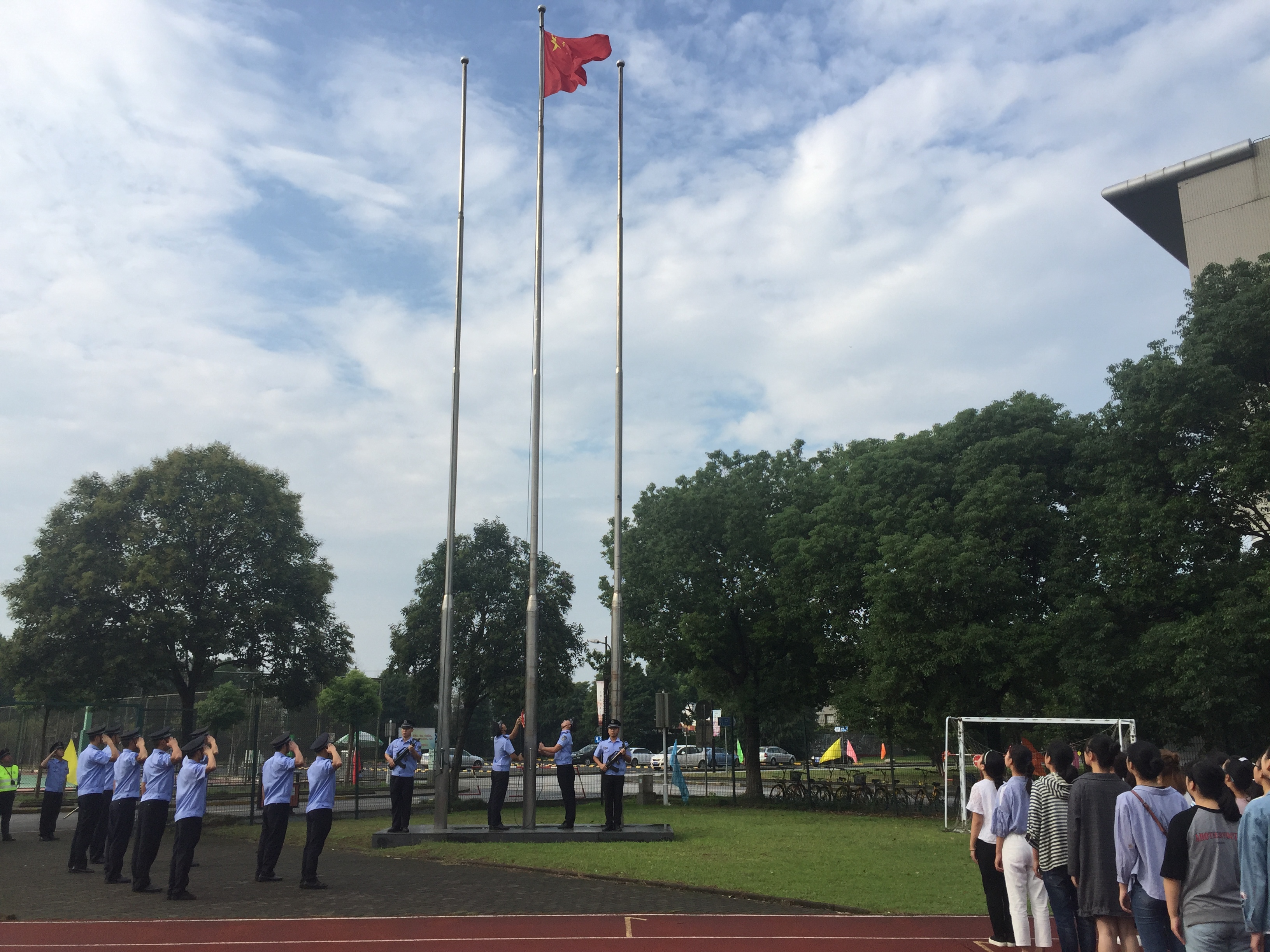 来自警务学院国旗班警训队员组成的护旗方队,迈着铿锵有力的步伐护卫国旗,在雄壮的《义勇军进行曲》中,五星红旗冉冉升起。全体同学脱帽站立,行注目礼。