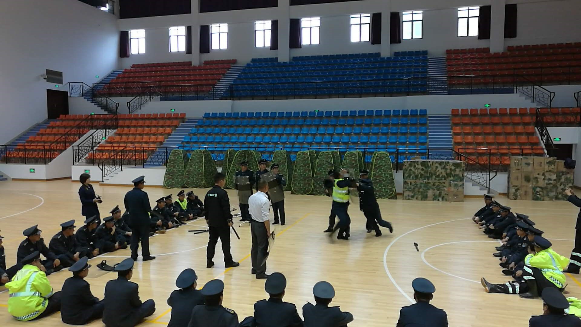 培训现场,张警官讲解了面对几种突发事件时如何处置的方法,并就盾牌、钢叉、警棍等警械器材使用以及常用的擒拿格斗术进行了现场教学,及时指正保安人员操作错误、纠正动作要领,鼓励保安员熟练掌握器材的使用技能和常用的紧急避护方法,切实提高保安员治安防范和应变能力,维护学校治安稳定。