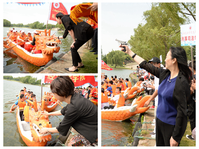 开幕式上刘晓红校长对此次比赛顺利举行致以热烈祝贺,并给参赛的老师和同学们以真诚的鼓励,希望他们取得良好的成绩。开幕式的最后一项流程是校领导为龙舟点睛。在刘晓红校长的发令枪响之后,比赛在喧天的鼓声以及岸边老师和同学们的加油助威声中开始。点了睛的龙舟承载着校领导对参赛队员们的祝福,在参赛师生们的共同努力下划向终点。