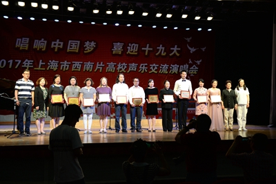 6月2日,由上海市教育工会主办,华东师范大学工会、上海市教育工会合唱协会承办的“唱响中国梦 喜迎十九大”2017年上海市西南片高校声乐交流演唱会在华东师范大学思羣堂如期举行,11支高校教工合唱团参加了演出。我校工会常务副主席周毅,带领由我校21名女教工组成的女声合唱团参加了此次演出。