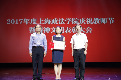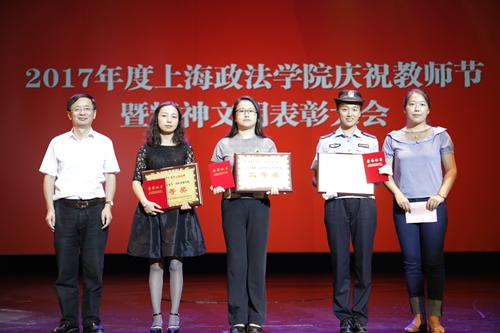 2016年度教书育人楷模经济法学院傅瑾宣读文明品牌三等奖颁奖词,获奖的是校团委“神奇烘培坊”——青年思想政治教育创新活动,上海纪录片学院“纪录Ÿ价值”——传播核心价值观,国际法学院国际商事模拟仲裁庭比赛——促进涉外卓越人才培养,学工部易班网络生态圈建设——“易”起来、在“易”起,社会管理学院“雏鹰”网络文化工作室——推行网络精神文明建设,高职学院“金手指”志愿者精神育人体系。副校长胡继灵和傅瑾共同为上述文明品牌代表朱慧博、姚久扬、石俭平、范琳琳、张弛、马莎莎颁奖。获奖代表高职学院马莎莎致获奖词。她表示,志愿服务不分你我,需要耐心、爱心和勇气,希望“金手指”的精神能够传播开来、传递下去。