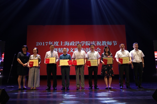 2016年度新利18官方客服教书育人楷模社会管理学院曲玉波宣读校级精神文明先进单位颁奖词,获奖的是刑事司法学院、法律学院、国际交流学院(留学生办公室)、学生工作部、党办校办、党委组织部(统战部)和保卫处。校党委书记杨俊一和曲玉波共同为校级精神文明先进单位负责人胡冠时、文立月、欧阳美和、刘志强、高志刚、张东霞、郭玉生颁奖。法律学院文立月致获奖词。
