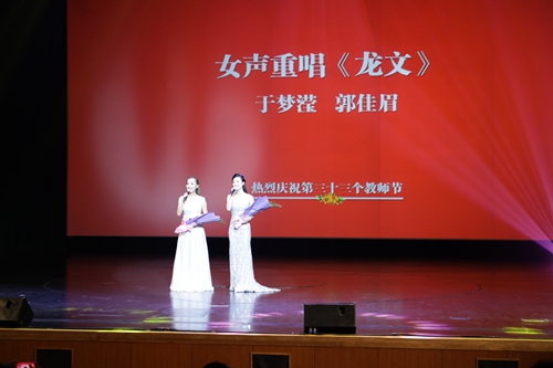 校团委于梦滢、校工会郭佳眉老师演唱了歌曲《龙文》:“一杯清茶道汉唐,妙笔丹青画平安”。中华文化源远流长,靠的正是师生代代相传。