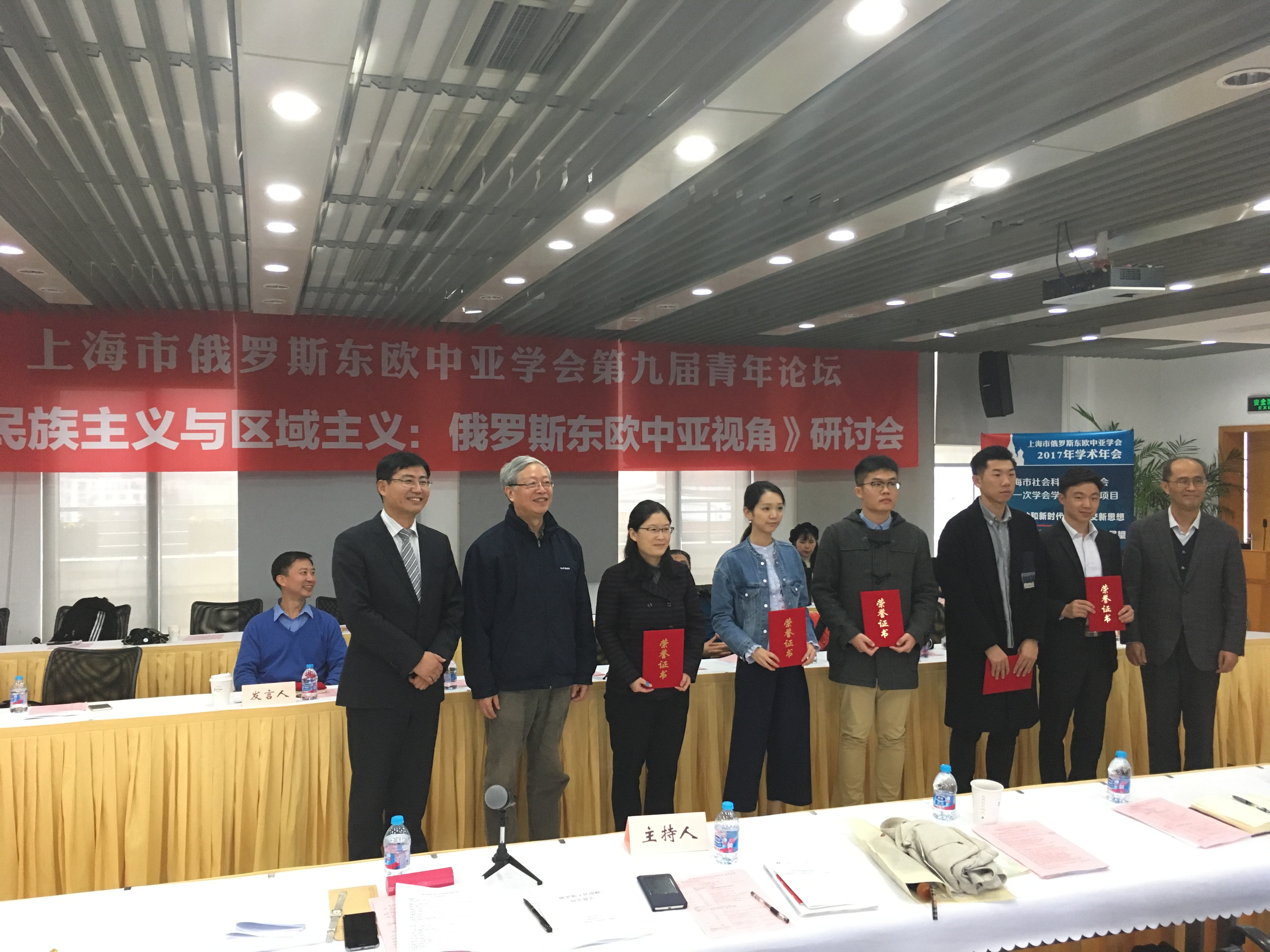11月17日,由中国-上海合作组织国际司法交流合作培训基地、上海市俄罗斯东欧中亚学会共同主办的“上海市俄罗斯东欧中亚学会2017年学术年会”在复旦大学新兴市场经济研究中心召开。我校上合培训基地秘书处副秘书长、国际事务与公共管理学院院长汪伟民教授作为主办方代表,以“新时代的中国外交战略与中美俄大三角”为主题作主旨发言,并作为颁奖嘉宾与学会领导一起为本年度学会青年论坛优秀论文获奖者颁发荣誉证书。
