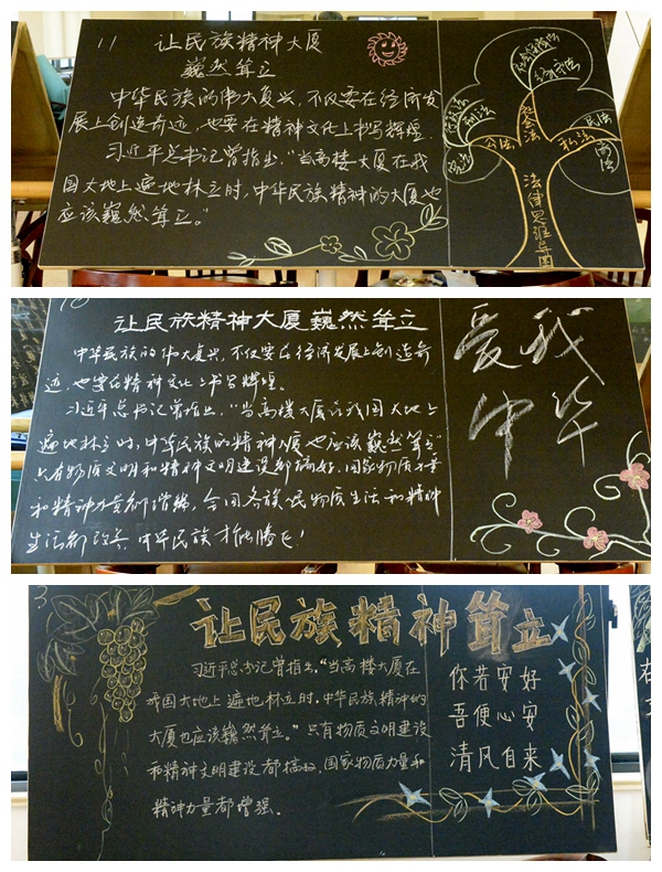 板书大赛规定黑板左边三分之二部分为指定内容,右边部分由老师们自由发挥。比赛中老师们一丝不苟,所写的板书严谨有序,或清秀俊逸,或笔势豪纵,或遒劲有力,或朴茂工稳,引得评委及旁观者连声赞叹。张张黑板上写满的不只是粉笔字,更是挥洒自如的个性。短短几十分钟,每位选手的作品都展示出老师们的独特书写魅力。