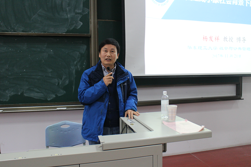 为使同学们了解我国在全面建成小康社会“决战”时期的第一线信息,并加深同学们对国家精准扶贫、精准脱贫的了解,11月21日,社会管理学院邀请到了华东理工大学社会与公共管理学院博士生导师杨发祥教授,于B4-105教室给同学们带来了“关于全面建成小康社会背景下的精准脱贫”讲座。学院劳动与社会保障教研室主任卢驰文,王慧博、杨玲丽老师出席了讲座,大一至大三劳动与社会保障专业同学到场参加。