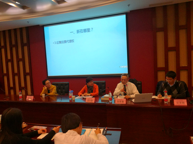 讲座伊始,朱锦清介绍了新作《公司法学》的创新之处,如增加公司会计一章,对董事的注意义务和忠诚义务、派生诉讼、征集投票代理权、刺穿公司面纱与“3+1”标准、有限责任公司和上市公司的不同特点作全面准确的阐述等。朱锦清在书中引用了许多美国公司法上的经典案例以更加清楚地阐明公司法的要义。朱锦清表示,希望这本书成为一本与国际先进水平全面接轨的公司法教材,也期望这本书对提高我国公司法的教学研究和审判水平有所帮助。