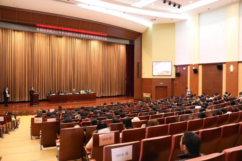 12月19日下午,外国语学院在天马讲堂召开了2017年学风建设总结会暨秋季学期考前动员大会。外国语学院院长张本梓、党总支书记姚善英、副院长夏甘霖、各教研室主任、辅导员及全体学生参加了此次大会。