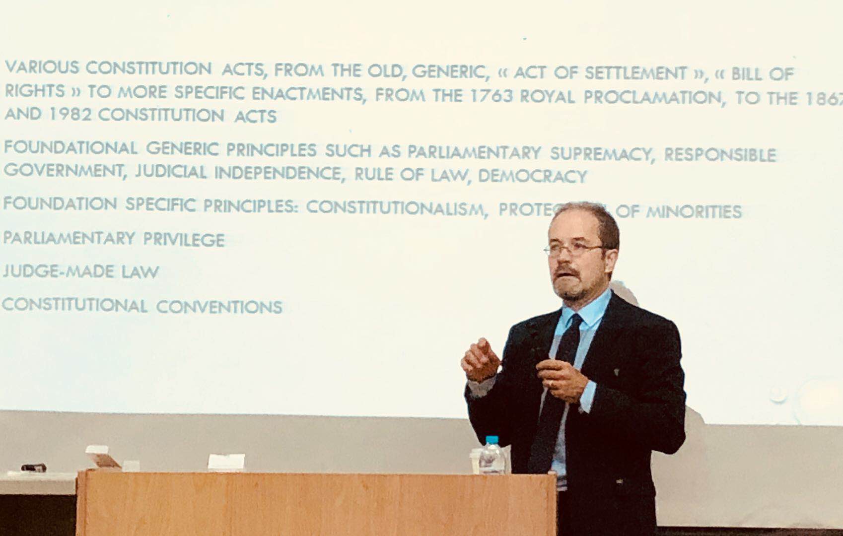 会后,简·弗朗西斯在庸夫楼106教室为我校师生做了题为《加拿大法律特色及其演变》的讲座。在讲座中,同学们积极发言、踊跃提问,探讨加拿大法律的相关问题。简·弗朗西斯还向同学们介绍了蒙特利尔大学合作交流项目,并对同学们的疑问进行了详细解答。(江南撰稿 董泊麟摄影)