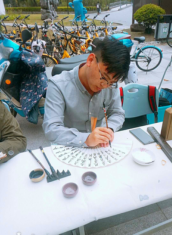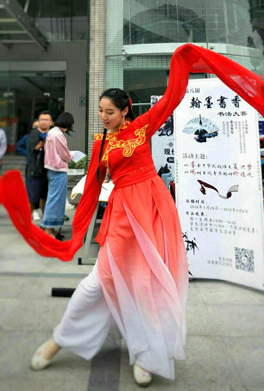 4月12日中午,翰墨香书法社在庸夫楼前开展了书法大赛的路演宣传活动,书法社优秀社员现场表演书法写作,墨水在纸上龙飞凤舞,众多同学受到感染而留步,领略到书法的艺术魅力,也收获了不少关于书写硬笔或软笔过程中的小技巧小经验。司音古风社的同学现场表演古风舞蹈,为活动添色。在福利环节,书法社向同学们赠送了由社员们精心所写的宣纸折扇和书签礼品,鼓励大家积极参赛,不但扩大了宣传效果,也使同学们感受了中国传统艺术的魅力。