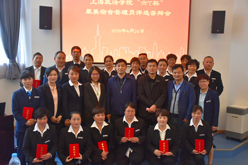 近年来,上海市教委开展了以“天天安全保障”“天天人性服务”“天天规范管理”“天天行为育人”“天天检查评估”和“天天反馈提高”为主要内容的学生公寓“六T”实务现场管理达标评估工作。为了进一步推进我校“六T”达标公寓建设,让广大师生充分地了解宿舍管理员可亲可敬可爱的一面,树立社区先进典型,4月24日下午,我校在上合组织基地107举办了“六T杯”最美宿舍管理员评选答辩活动。上海市学校后勤协会公寓专业委员会副秘书长陈澄,校后勤保障处副处长祝耀明、学生处副处长柯心、保卫处副处长马洪亮出席了答辩会。社区工作人员、学生代表70余人参加了活动。