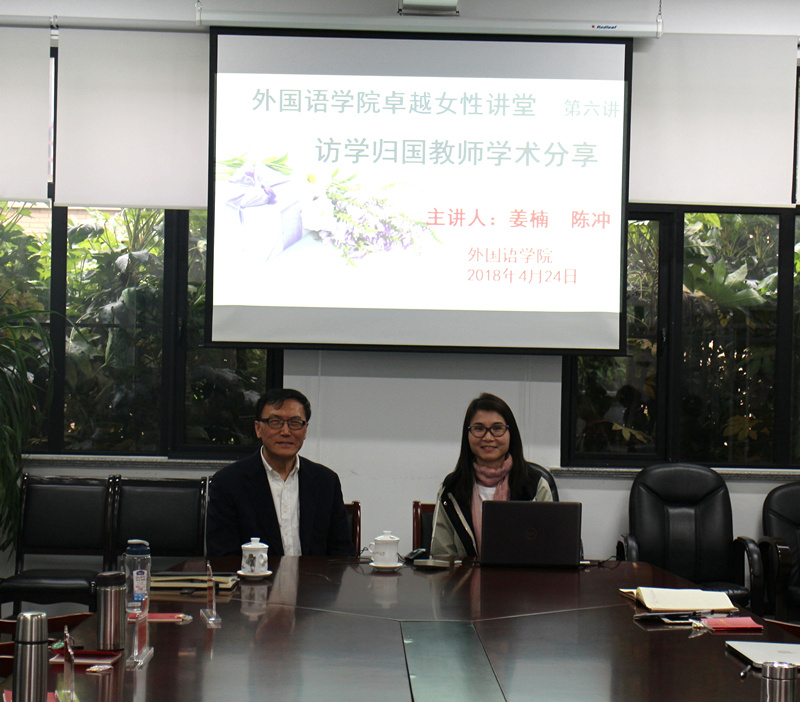 4月24日下午,外国语学院举办“卓越女性讲堂”第六讲暨“一个党员一面旗,亮牌上岗展风采”系列活动。讲座由国外访学刚刚归来的姜楠、陈冲老师主讲,张本梓院长主持。外国语学院全体教师参加了活动。