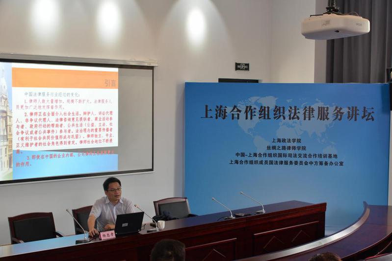 9月21日下午,华东政法大学文伯书院院长杨忠孝教授为上海合作组织法律服务讲坛就“一带一路、制度变革与法律服务”进行了专题讲座,并与我校丝绸之路律师学院师生进行了互动交流。上合培训基地合作部副主任、上海合作组织法律服务委员会中方筹备办公室执行秘书长姜思源主持讲座。