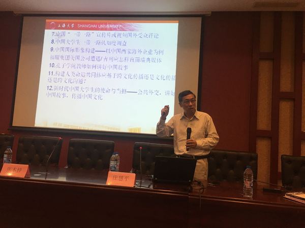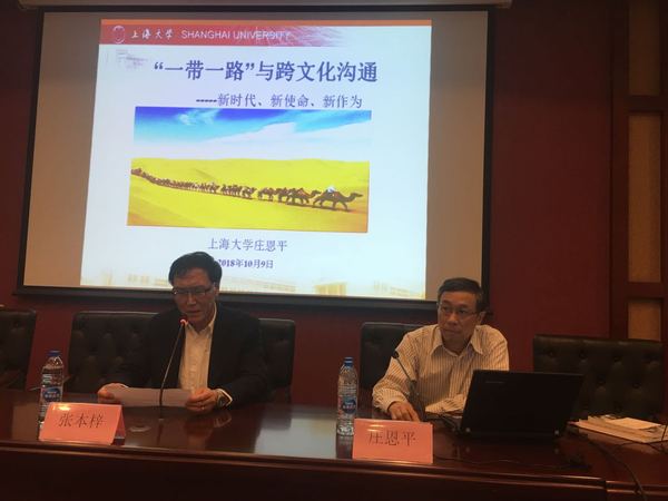 10月9日下午,上海大学庄恩平教授为外国语学院“杰出学人讲堂”作了题为“一带一路与跨文化沟通”讲座。讲座由外国语学院院长张本梓教授主持,学院全体教师和部分学生参加。