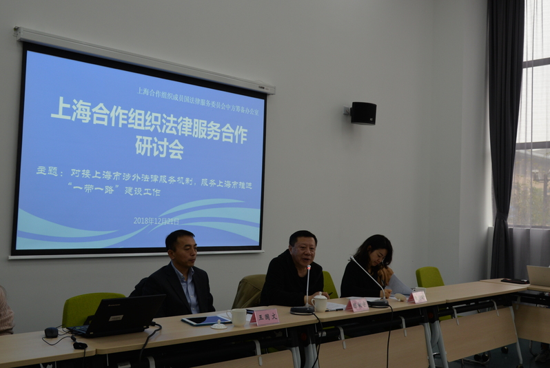 12月21日下午,上海合作组织法律服务合作研讨会在中国-上合基地召开,探讨中国-上海合作组织国际司法交流合作培训基地和上海合作组织法律服务委员会中方筹备办公室对接上海市涉外法律服务机制,服务上海市推进“一带一路”建设工作。上海市政府外事办公室综合处调研员陈翔宇、上海市司法局办公室副主任张婷婷和中国宏立城集团总裁助理王国文受邀列席;中国-上合基地办公室战略规划部主任石其宝,文献信息部主任张少英,研究咨询部主任赵运锋,研究咨询部常务副主任贾少学,经济管理学院院长刘志强参加了研讨会,并与丝绸之路律师学院学生进行了沟通交流。中国-上合基地办公室合作部主任、上海合作组织法律服务委员会中方筹备办公室执行秘书长姜思源主持会议。
