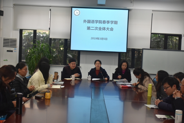 姚善英从聚焦人才培养、教师队伍建设和体制机制改革三个方面传达了学校2019年五项重点工作部署。她表示,外国语学院将结合学院实际,从以下几个方面认真落实学校重点工作部署:一是以落实评估整改为抓手,深化教学改革,提升教学管理水平和人才培养质量;二是以硕士点申报为关键,推动外语学科发展;三是在培养学院青年教师的基础上,做好人才招聘和引进,加强人才队伍建设;四是探索适合学院两级管理的模式,充分激发每位教师的工作积极性;五是以落实巡视整改为契机,加强党风廉政建设,明确工作责任分工,全面从严治党。