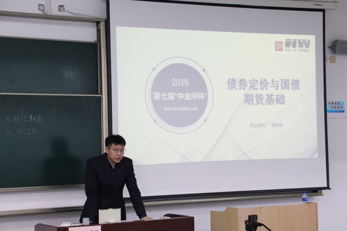 主办方老师介绍宣讲会目的以及本次“中金所杯”全国大学生金融知识宣讲会的特点。国富期货的孙燕老师讲述了股指期货的基础知识,国富期货的姚晓晨老师介绍了债券定价与国债期货基础。在讲述过程中,与同学们积极互动,有问有答。最后,主办方老师简述了本次大赛前的主要课程为六个方面:金融基础、股指期货、国债期货、金融期权、外汇期货和衍生品。
