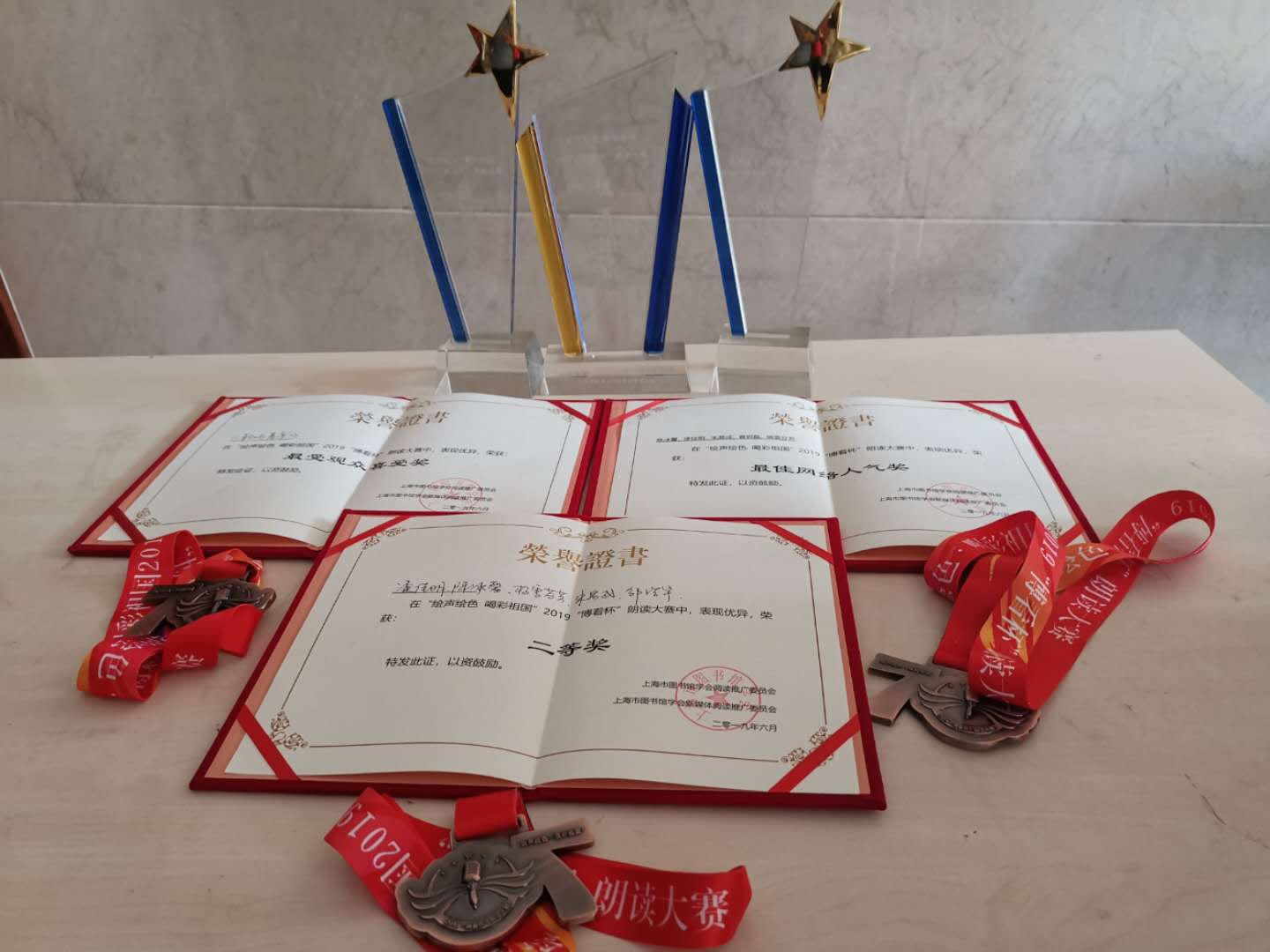 6月14日,由上海市图书馆学会阅读推广委员会主办的“绘声绘色 喝彩中国”——2019“博看杯”朗读大赛决赛在上海师范大学进行,共有18支高校图书馆和区县图书馆代表队进入决赛。我校图书馆选送的,由漆佳明、陈冰馨、杨雪芬芳、朱易成、邹浩宇五位同学组成的队伍与来自上海师范大学、复旦大学、嘉定图书馆等代表队展开激烈角逐。最终我校代表队凭借扎实的朗诵基本功和自信的表达力,以一首慷慨激昂的《聆听青年》荣获二等奖,还获得了最佳网络人气奖、最受观众喜爱奖,我校图书馆荣获优秀组织奖。