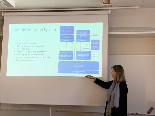 6月28日,代表团与赫尔辛基应用科学大学资深教授Tiina Laurila会面,双方以中芬教育体系比较为主题,进行了深入交流。胡继灵表达了与芬兰高校开启交流合作、学生互换,选派教师参与师资培训、能力提升的意愿,邀请芬兰专家来我校授课、合作科研等的意向,对方充分介绍了赫尔辛基应用科学大学专业设置和学生培养模式。当日,代表团还与北欧教育科技交流中心项目主管Amanda Fan进行了会谈。代表团顺访了古老的赫尔辛基大学,走访了赫尔辛基大学主教学楼、法学院、图书馆。