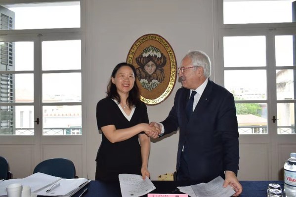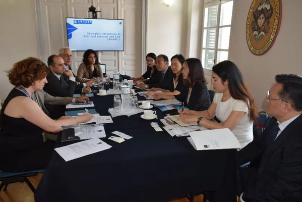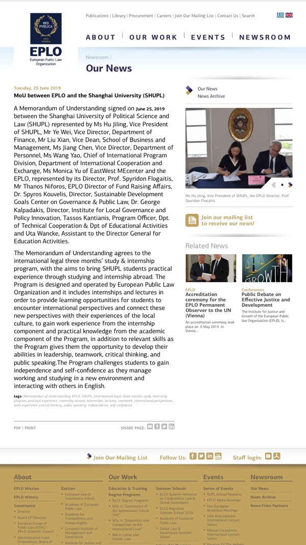 6月25日,代表团应邀访问了欧洲公法组织并举行我校学生赴该组织进行3个月的国际学习实习项目签约仪式。该项目为落实上海市教育委员会资助上海市高校学生赴国际组织实习的号召,依据《上海市教育委员会资助上海市高校学生赴国际组织实习项目管理办法(试行)》和《新利18官方客服落实市教委资助上海市高校学生赴国际组织实习项目管理办法(试行)》的规定,由欧洲公法组织负责设计,以便为我校学生提供学习和实习机会,从项目的实习环节获得工作经验,从学术环节获取实用知识。经过前期良好沟通,该项目于2019年5月在我校发布。欧洲公法组织非常重视此次活动,欧洲公法组织主席Spyridon Flogaitis教授、主任Vassiliki Lykoura女士、政府管理与政策改革研究院主任George Kalpadakis教授、资金筹措部主任Thanos Niforos、欧洲法和政府管理学院教育活动主任助理Uta Wancke参加会谈与签约仪式,并邀请了合作伙伴加入会谈,包括希腊前外交官、现任政府与公法可持续发展中心主任Spayros Kouvelis博士、企业发展专家Christina Deligianni等专家和管理人员,就加强我校与欧洲公法组织的合作交流和教育等领域的合作交换意见。胡继灵详细介绍了我校相关情况,表示中希同为文明古国,都有重视教育和研究的古老传统,我校与欧洲公法组织的学生3个月实践项目只是开端,未来将进一步加强全方位的合作。Spyridon Flogaitis非常赞赏我校落实该项目的执行力,双方签署了合作备忘录,以此为契机,建立更加紧密的合作关系,为提升双方教育国际影响力、竞争力作为贡献。