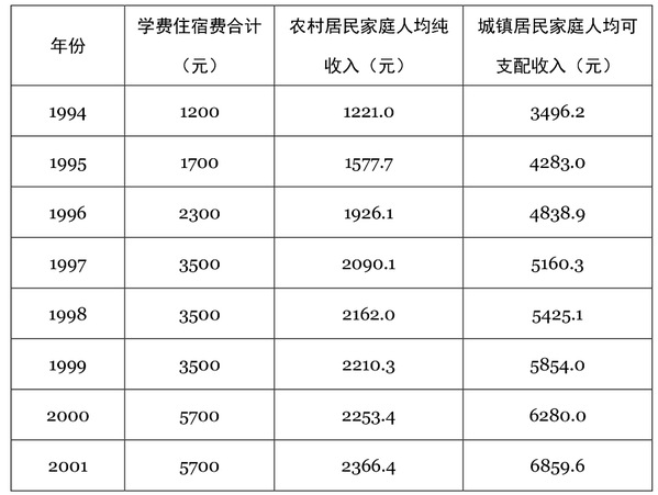 三是贫困生就学难现象日渐突出。大学的学费根据所处地方和院系不同略有差异,以某大学金融系为例(选取某大学金融系的原因如下:作为教育部直属院校,某大学具有一定的代表性,且地处天津,物价水平相对较低,因此学费也比较低;选取金融系,是因为数据易于收集),从1994年到2001年,其历年学费加住宿费与同时期内地农村和城镇居民家庭人均可支配收入的比较如表1所示。