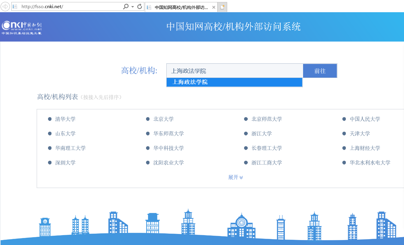 1.访问网址:http://fsso.cnki.net,在页面上的“高校/机构”输入框里输入“新利18官方客服”,点击“前往”。