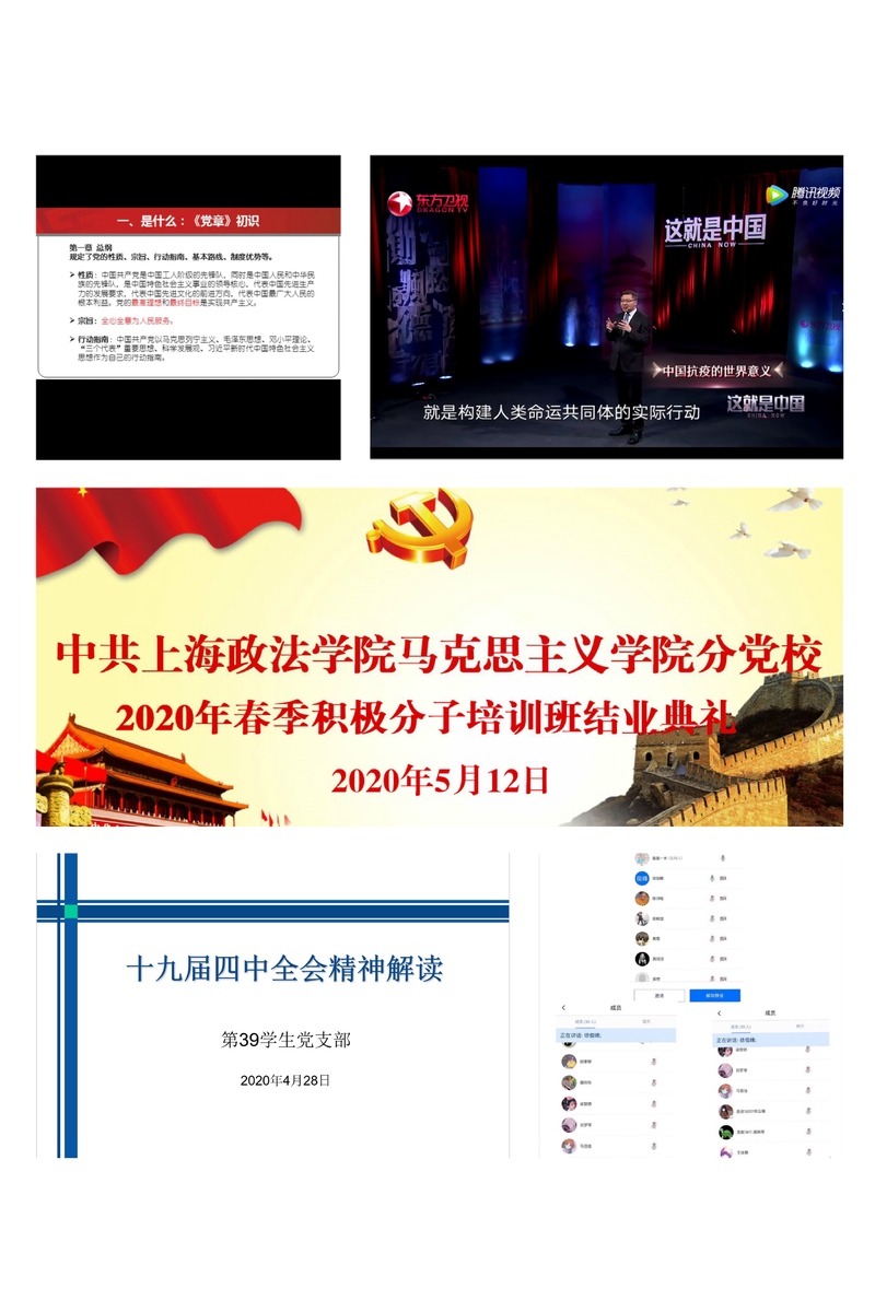 受新冠疫情的影响,本期入党积极分子培训课程分为线上授课、互动和线下自学两部分。授课环节,学院党总支书记徐俊峰结合疫情主讲“疫情防控下的中国制度优势”,学生党支部书记王颖为大家解读十九届四中全会精神,组织员宋欢老师讲解了发展党员工作细则、中国共产党章程等内容。同时还利用网络资源聆听了一些专家教授的授课;互动环节,邀请了我校优秀毕业生党员成彦彦和研究生党员唐佳敏同学分享了假期参与防疫的所感所悟,并且在最后一次课进行了精彩热烈的分组讨论;线下自学主要包括新党章、《关于新形势下党内政治生活的若干准则》《中国共产党党内监督条例》和《中国共产党发展党员工作细则》等内容。