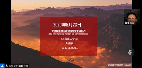 5月23日,国际法学院“法说”第32期通过腾讯会议在线举办,上海市协力律师事务所高级合伙人、上海进出口商会副会长、中国商务部政府法律顾问、我校硕士研究生实务导师张振安律师受邀作“国际贸易风险与争议解决”学术讲座。讲座由国际法学院教授王祥修主持,国际法学院研究生及部分本科生聆听了讲座。