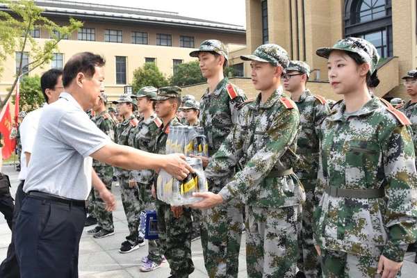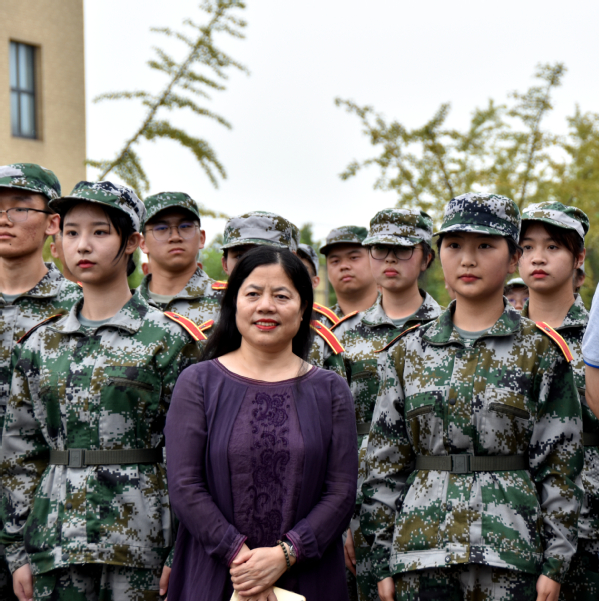 军训期间,法律学院院长侯怀霞、党总支书记文立月、党总支副书记陆嵬在搏越馆前慰问了学院2019级全体参训学生和负责本次军训的武警教官。