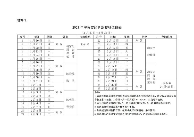 校后勤保障处2021年1月20日(周三)—2月26日(周五)安排专人值班,协调学校后勤保障工作(值班人员见附件1)。后勤保障处2月24日开始正常上班。