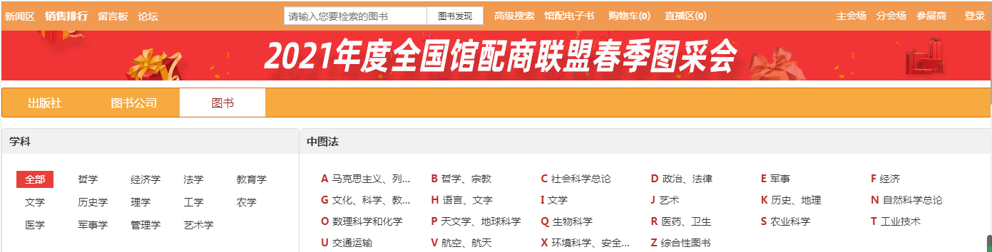 2.1 出版社分会场:按出版社综合分类和出版公司名称展示各出版社图书,点击分类首先展示该类别下的出版社名单,点击出版社名称即可进入选书界面。
