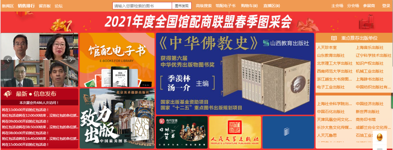 1.主会场:其左上角展示领导讲话及平台消息发布。其他板块主要展示重点出版社书目,直接点击出版社名称即可进入选书界面。