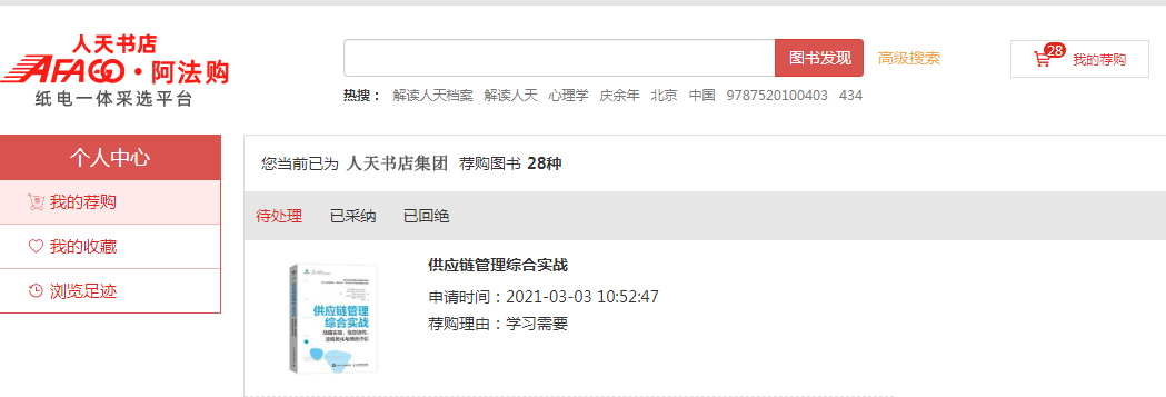 4.我的荐购:【个人中心】→【我的荐购】 中可查看到所有的荐购书目,及图书馆的采纳情况。