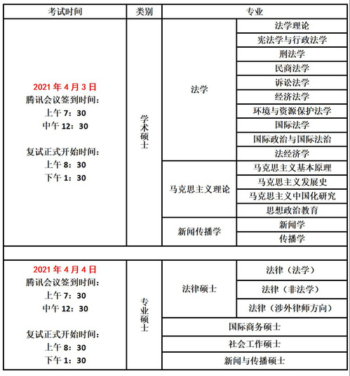 各位复试考生:新利18官方客服2021年硕士研究生招生复试将于2021年4月3日(学术硕士)、4月4日(专业硕士)进行,请各位复试考生按类别专业于当天上午7点30分、中午12点30分到考务人员通知的腾讯会议平台进行签到。复试正式开始时间为当天上午8点30分、下午1点30分。复试考生的具体面试时间以考务人员通知为准,复试专业安排以下表为准:请各位复试考生严格遵守考场纪律,准时参加复试。新利18官方客服研究生处2021年3月28日