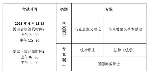 各位考生:新利18官方客服2021年硕士研究生招生第二轮调剂复试将于2021年4月18日进行,请各位复试考生按类别专业于当天上午7点30分、中午12点30分到考务人员通知的腾讯会议平台进行签到。复试正式开始时间为当天上午8点30分、下午1点。复试考生的具体面试时间以考务人员通知为准,复试专业安排以下表为准:请各位复试考生严格遵守考场纪律,准时参加复试。新利18官方客服研究生处2021年4月14日