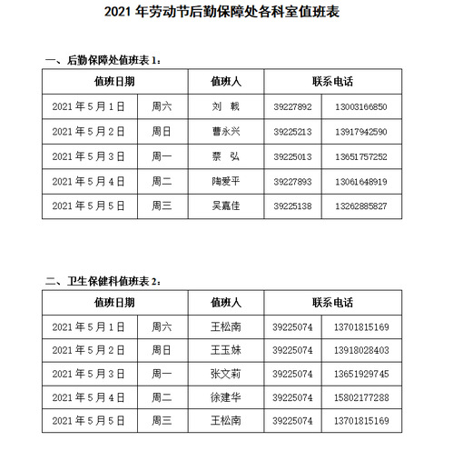 一、后勤保障处值班安排:2021年5月1日(周六)—5日(周三)期间安排专人值班,协调学校后勤保障工作。【详见附件值班表1】