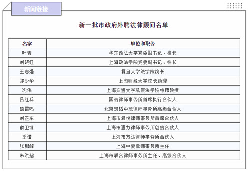 2015年起,本市全面推行政府法律顾问制度,为推进上海法治建设特别是法治政府建设发挥了重要作用。经过选聘委员会面向社会公开选拔,叶青、刘晓红、王志强、郑少华、沈伟、吕红兵、盛雷鸣、刘正东、俞卫锋、季诺、张鹏峰、朱洪超受聘为新一批市政府外聘法律顾问。