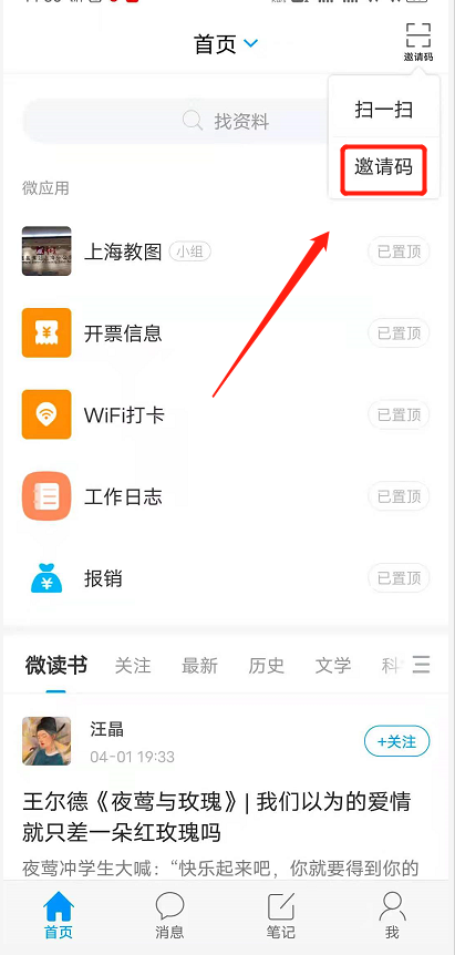 STEP3:注册完成后在学习通首页右上角点击“邀请码”字样后并输入邀请码:shzftsg(上海政法拼音首字母)