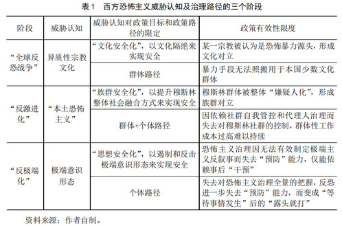 “全球反恐阶段”与“反激进化”阶段,恐怖主义威胁认知的核心是围绕伊斯兰教和穆斯林群体,分别针对异质性文化和异质性文化群体的“安全化”。在“多元文化主义已死”的政治话语之下,西方各国被指责将原本用于社会多元文化群体治理的内部民族政策“安全化”为国家安全治理手段,以针对国内穆斯林群体的“反激进化”政策,从而应对本土极端化乃至恐怖主义问题带来的严重社会后果。