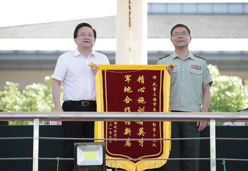 今年军训是我校历史上人数规模最大的一次。在疫情防控的特殊形势下,武警上海市总队执勤第三支队克服重重困难,为我校军训顺利实施给予了极大支持。近百名部队教官每日迎着晨曦来、披着晚霞归,用心用情指导学生军训、帮助学生成长。校党委书记夏小和代表学校向武警上海市总队执勤第三支队赠送锦旗,向“最可爱的人”表达敬意。杨玉明代表支队接旗。