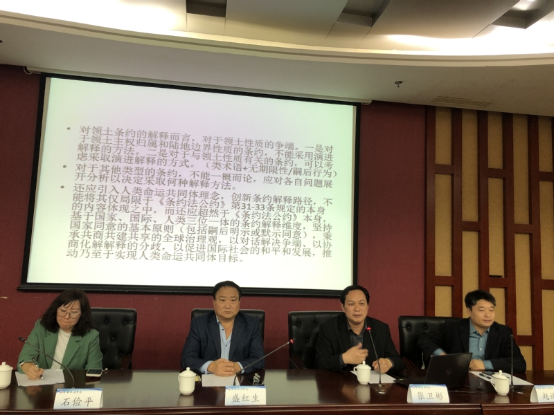讲座中,张卫彬教授以芝诺的箭悖论、赫拉克利特的河悖论等哲学理论引述了国际法必须跟进国际社会所经历的发展和形势的演变。随后,张教授借助丰富的学说与案例,分别从演进解释与静态解释的理论渊源、演进解释的法理基础、演进解释与静态解释的实然分野以及演进解释、静态解释的中国方案等四个部分内容讲述。就条约的解释而言,他认为对于领土主权归属和陆地边界性质的条约,不能采用演进解释的方法;对于与领土性质有关的条约,可以考虑采取演进解释的方式;对于其它类型的条约,不能一概而论,应对各自问题展开分析以决定采取何种解释方法。此外,还应引入人类命运共同体理念,创新条约解释路径。