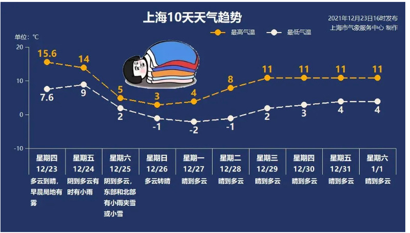 根据上海中心气象台2021年12月23日发布的上海市天气预报:24日下午起,寒潮天气开始影响本市,将带来大风和降温。24日(周五)下半夜到25日(周六)白天本市有6~8级偏北大风,26日(周日)至29日(下周三)本市有持续低温冰冻天气。