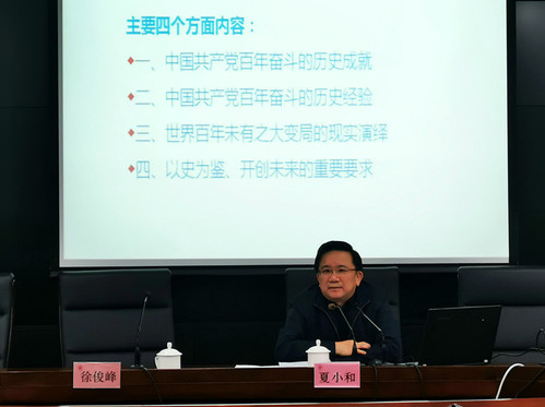 夏小和首先按照时间线索,从新民主主义革命的胜利、社会主义制度的确立、中国特色社会主义理论体系的形成、新时代中国特色社会主义的开创四个历史阶段,梳理了中国共产党百年奋斗的历史成就。在此基础上,逐一解读了中国共产党百年奋斗的十条宝贵历史经验。接着,从世界经济中心之变、世界政治格局之变、全球化进程之变、科技与产业之变、全球治理之变五个维度世界百年未有之大变局的现实演绎作重点分析,并指出了以史为鉴、开创未来的重要要求:必须坚持正确的理论指南,必须坚持社会主义实践探索的重要方略,必须坚持优良的工作作风和忧患意识,必须坚持优秀青年力量的培育。最后,夏小和对青年学生提出了殷切希望:坚定信念、厚植家国情怀;珍惜大学时光、学好文化知识;投身社会实践、奉献青春年华。