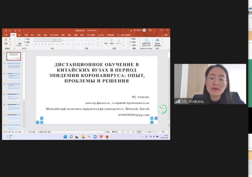 4月22日,由俄罗斯下诺夫哥罗德国立大学举办、下诺夫哥罗德教育与研究促进基金会协办的“教育发展趋势:俄罗斯与国际优秀经验”国际学术研讨会在下诺夫哥罗德大学正式开幕。会议采用线下线上结合的形式进行,来自俄罗斯、中国、哈萨克斯坦、土耳其近百名专家学者参与了此次会议。我校语言文化学院(国际交流学院)华莉教授,刘净娟博士、牧阿珍博士、赫潇博士等四位教师受邀参会,并在会议分组的“外语与高等教育国际化”圆桌会议上宣读论文。