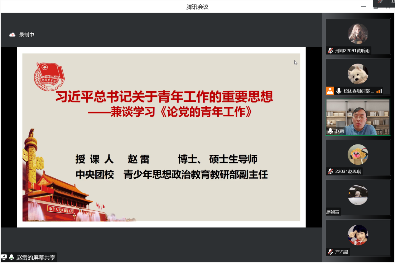 下午,“青马工程”全体学员认真学习了由中央团校青少年思想政治教育教研部赵雷老师讲授的主题讲座——学习习近平总书记关于青年工作的重要思想——兼谈学习《论党的青年工作》。赵雷老师旁征博引,贯通古今中外,为学员们讲述了青年工作的战略地位、青年工作的职责使命、青年一代健康成长的正确道路、青年工作的路径方法和共青团改革发展的目标任务。在这场深入浅出的讲座中,学员们对自己的职责有了更深刻的体会,对自身的革新性、进步性、主体性、可塑性有了更充分的认识。
