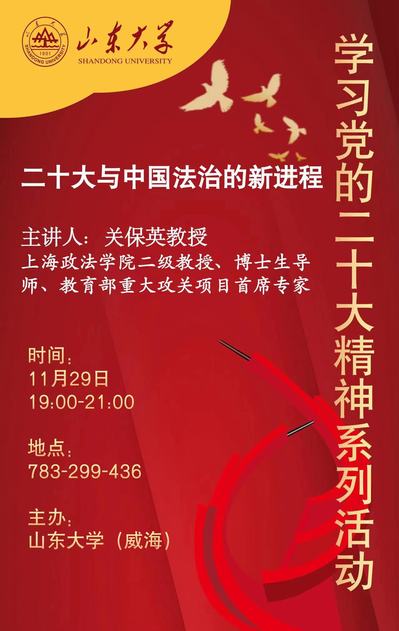 11月29日晚,上海市人民政府参事、新利18官方客服教授关保英为山东大学(威海)师生作了“二十大与中国法治的新进程”讲座。山东大学(威海)副校长肖金明教授主持讲座并作点评。