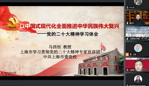 培训班首场报告特邀上海市学习贯彻党的二十大精神专家宣讲团成员、上海市委党校社会学教研部主任马西恒教授,作“以中国式现代化全面推进中华民族伟大复兴”的专题辅导报告。他以中国式现代化为中心和主线,结合大历史观和全球视野,帮助参会人员深刻领会党的二十大报告在政治上的高瞻远瞩、理论上的深邃思考、目标上的科学设定和工作上的战略部署。他在全景式扫描党的二十大报告总体框架的基础上,围绕中国式现代化的生成逻辑、本质要求、强国战略和总体布局等,重点阐释中国式现代化与党的百年奋斗和新时代十年伟大变革的关系、与全面建成社会主义现代化强国的关系、与未来五到十年战略部署的关系,明确了在世界百年变局中牢牢掌握国家发展主动权的战略支点,明确了全面领会和贯彻落实党的二十大精神应当准确把握的关键节点。他认为,学习党的二十大报告还应关注“伟大建党精神”“全过程人民民主”“人民城市理念”“长三角一体化发展”等与上海密切相关的内容,用新的伟大奋斗创造新的历史伟业。