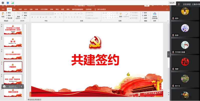 在线上共建签约环节,上海市中医医院急诊党支部书记闫国良在介绍本次活动的背景、基本情况时,明确提出,两个党支部的共建签约得益于上海市教卫党委搭建的“双带头人”党支部书记工作室网络平台,为大家提供沟通合作机会。本次合作旨在分享工作资源、交流工作经验、解决实际问题,在共建合作中实现党的建设与事业发展良性互动,促进双方基层党建工作提质增效、精神文明创建工作再创佳绩。刑事司法学院教工党支部书记王娜为与会党员作题为“研修新《党章》,尊崇新《党章》”专题党课讲授。王娜阐述了《中国共产党章程》的重要历史地位和鲜明特点,梳理了习近平总书记关于党章的论述,解读二十大报告中对党章的界定,通过新旧党章对比,解读新党章的新内容和新要求,使得与会党员深刻认识到,党章是党的总章程,是全体党员言行的总规矩和总遵循,对坚持党的全面领导、推进全面从严治党、加强党的建设具有根本性的规范和指导作用。